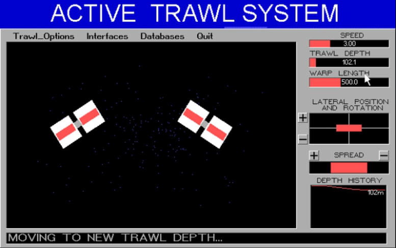 The mouse-driven control panel on the right hand side of the screen allows the trawl speed, warp length, trawl depth,