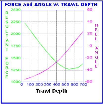 Below is a graph which typically illustrates the forces and heel angles required to maintain a trawl at a particular